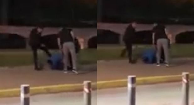 De acuerdo con la grabación, los dos sujetos, quienes son presúmeteme cadeneros del lugar, amagaron y tiraron al suelo al chico.