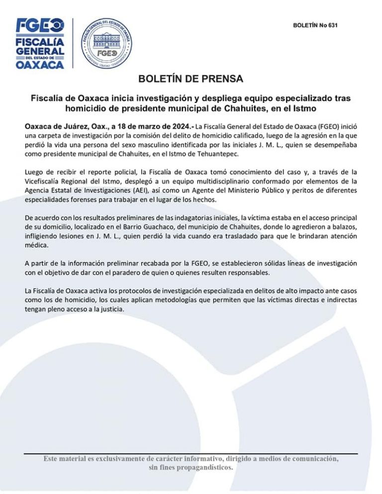 “Se inició una carpeta de investigación por la comisión del delito de homicidio calificado, luego de la agresión en la que perdió la vida una persona del sexo masculino identificada por las iniciales J. M. L., quien se desempeñaba como presidente municipal de Chahuites, en el Istmo de Tehuantepec”, escribió el organismo en redes sociales.