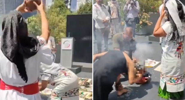 Ciudad de México. – Un grupo de personas vestidas con atuendos típicos de determinado pueblo, sacrificó a una gallina en los alrededores del Senado de la República.