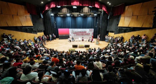 En el auditorio “Alejo Peralta”, del Centro Cultural “Jaime Torres Bodet”, la morenista fue recibida con expresiones de apoyo.