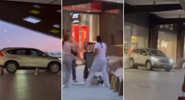 Las imágenes muestran cómo el vehículo retrocede varios metros hasta subir la acerca del centro comercial e impactarse contra el mismo, de lleno, destruyendo las puertas de cristal del lugar.