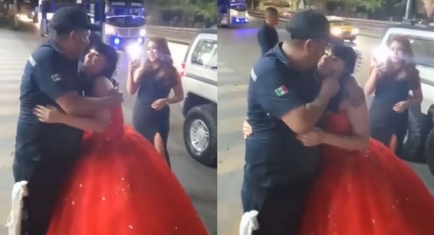 La joven estaba dando el tradicional paseo en limusina con sus damas de honor y chambelanes por calles de la ciudad, sin embargo, lo que se robó la atención de miles de internautas es el momento en que la cumpleañera desciende el auto, se encuentra con su papá y lo abraza.