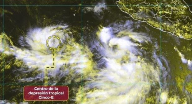 La instancia federal también informó que esta depresión fue denominada depresión tropical Cinco-E, la cual se localiza a 885 kilómetros al sur-suroeste de Cabo San Lucas, en Baja California Sur, y a 970 kilómetros al oeste-suroeste de Cabo Corrientes, Jalisco.