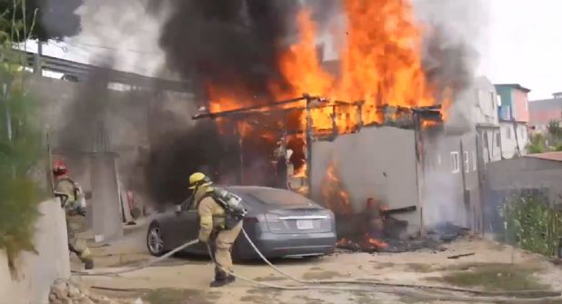 En redes sociales han circulado algunos videos de este incendio, en los que es posible observar a los bomberos combatir el incendio, el cual generó fuertes llamas, que terminaron por alcanzar a la vivienda aledaña. También es posible observar que el auto Tesla quedó consumido de la parte delantera y con el parabrisas destrozado.