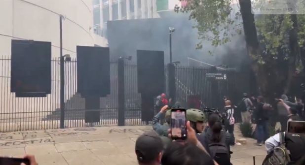 Además de haber lanzado petardos, también se realizaron algunas pintas en las instalaciones del recinto legislativo, donde hoy siguen los análisis de los dictámenes de la reforma a la Guardia Nacional y del reconocimiento a los derechos de las comunidades originarias y afromexicanas.