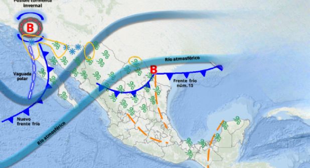 "Un nuevo frente frío se aproximará y recorrerá el noroeste y norte de México, en interacción con una vaguada polar y una circulación ciclónica en niveles medios y altos de la atmósfera y con la corriente en chorro polar y el río atmosférico, dando origen a la primera tormenta invernal; situación que ocasionará lluvias con chubascos en dichas regiones, con lluvias puntuales muy fuertes en Baja California.