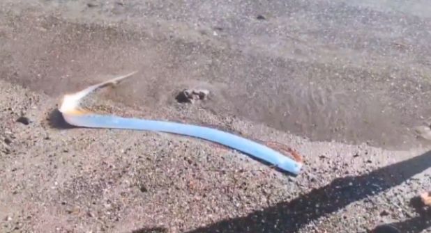 El pez, cuyo nombre científico es Regalecus Glesne, fue grabado por el turista estadounidense Robert Hayes. En el video se aprecia al pez nadar en la costa de la playa. También se observa como un hombre intenta regresarlo al mar, pero el se aferra a estar en la orilla.