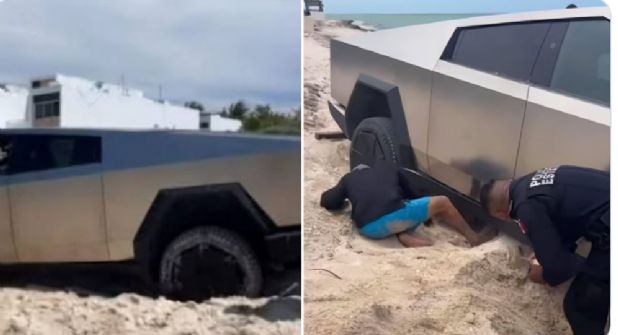 Yucatán.- Una lujosa camioneta Cybertruck de Tesla, con un valor estimado de más de dos millones de pesos, terminó atrapada en la arena en una playa de San Benito, en el municipio de Dzemul, Yucatán.