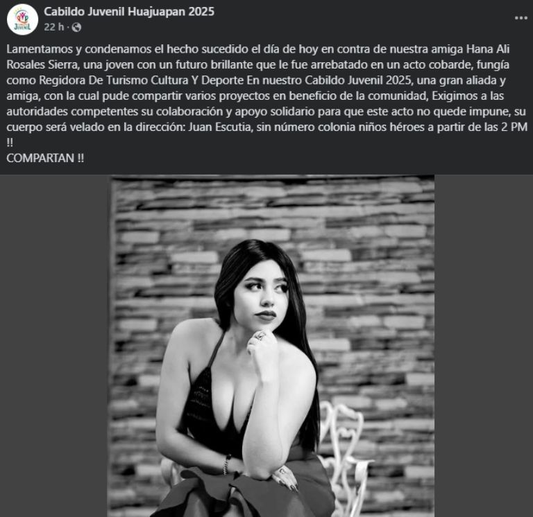 “Lamentamos y condenamos el hecho sucedido el día de hoy en contra de nuestra amiga Hana Ali Rosales Sierra, una joven con un futuro brillante que le fue arrebatado en un acto cobarde, fungía como regidora de Turismo Cultura y Deporte en nuestro”, expusieron en un comunicado.