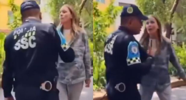 En las imágenes se observa a una mujer, de cabello rubio y vestida con una chamarra clara, discutiendo de forma agresiva con un policía que portaba el uniforme de la Secretaría de Seguridad Ciudadana (SSC).