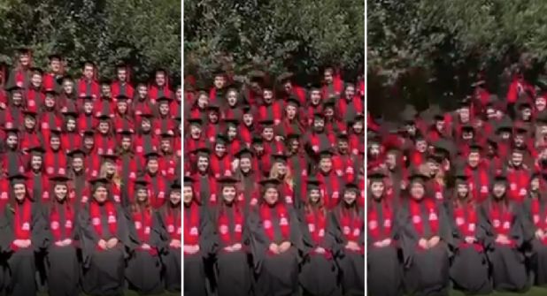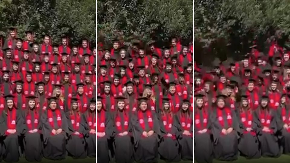 Las y los jóvenes, con toga y birrete, fueron colocados de manera estratégica para la foto, sin embargo, algo falló y la estructura donde los recién graduados estaban posicionados se derrumbó, enviando a los chicos al suelo.