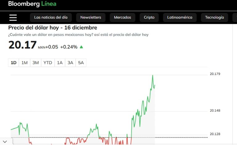 Al inicio de la jornada del 16 de diciembre, el dólar se cotiza en 20.16 pesos por unidad verde, de acuerdo con Bloomberg esto representa un fortalecimiento del 0.26 por ciento o 5.2 centavos por cada billete.