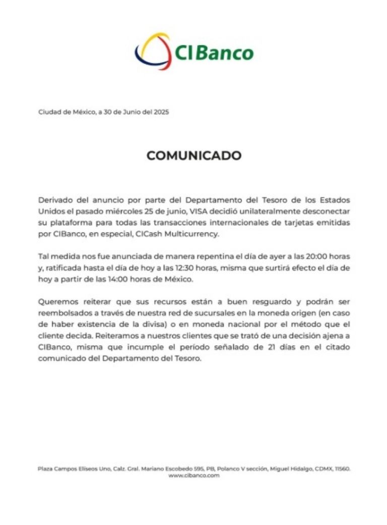 “Derivado del anuncio por parte del Departamento del Tesoro de los Estados Unidos el pasado miércoles 25 de junio, VISA decidió unilateralmente desconectar su plataforma para todas las transacciones internacionales de tarjetas emitidas por CIBanco, en especial, CICash Multicurrency.