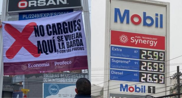La gasolinera Mobil ubicada en la avenida San Jerónimo de Monterrey se convirtió ayer en la primera de todo el país en recibir una manta de advertencia de la Profeco por los altos precios que aplica a su combustible regular o verde.
