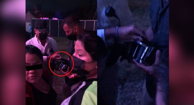 Mediante redes sociales se dio a conocer un video donde aparece la sospechosa siendo inspeccionada, mientras una persona de seguridad del evento toma con ambas manos los teléfonos.