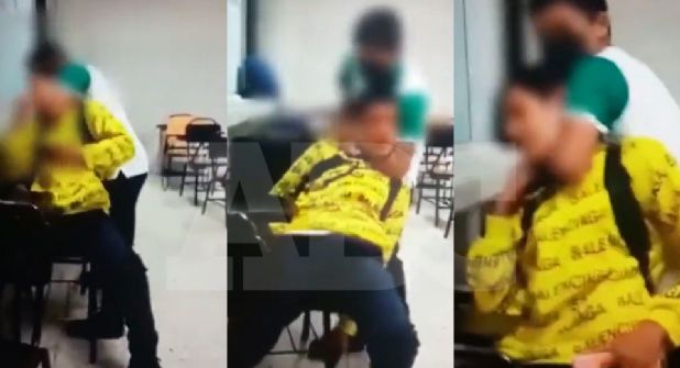 Guadalupe.- A través de redes sociales se difundió un vídeo del momento en que un alumno de una preparatoria Conalep, en el municipio de Guadalupe, ahorca a uno de sus compañeros hasta casi desmayarlo dentro de un salón de clases.