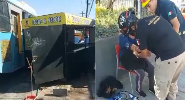 Elementos de Protección de Monterrey reportó que el conductor de la ruta de pasajeros, identificado Víctor, se impactó contra el puesto de tacos al perder el control de la unidad.