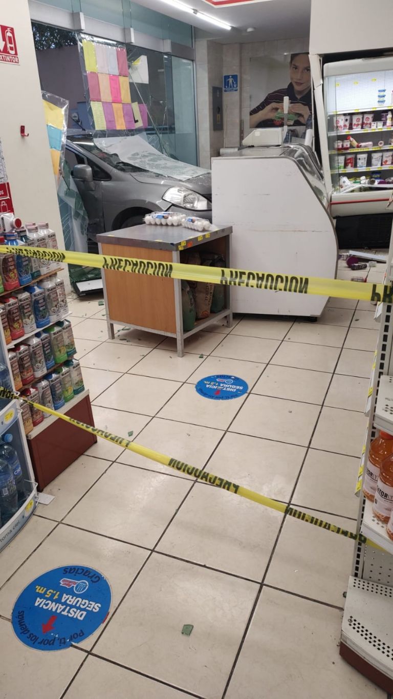 El automóvil de la pareja salió proyectado y atravesó un ventanal, quedando dentro del negocio, al que causó daños estructurales en las paredes y dañó severamente la zona de carnes frías y el cuarto frío, por lo que las autoridades acordonaron el área.
