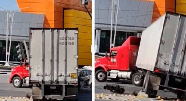 Al ver que le era complicado dar reversa y hacer un nuevo intento, el trailero optó por acelerar, lo que provocó el arrastre del semáforo cuyo azote contra el pavimento causó su destrucción y un sonoro estruendo.