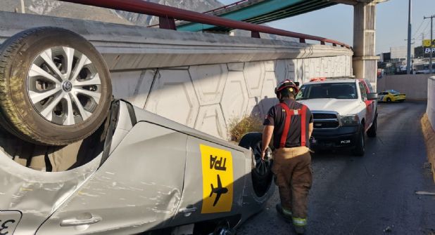 Monterrey.- Un auto del Servicio de Taxi del Aeropuerto Internacional de Monterrey se volcó sobre la avenida Revolución en su cruce con avenida Garza Sada, al sur del municipio de Monterrey.