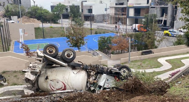 Monterrey. – Un camión revolvedor se volcó esta mañana de lunes 23 de octubre en la colonia Cumbres Elite, en el municipio de Monterrey.