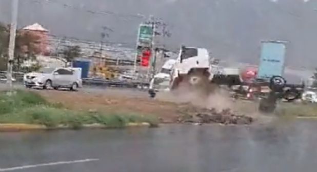 El momento exacto en el que sucede el accidente, quedó grabado por un conductor, donde se puede apreciar como el camión derrapa sobre el pavimento.