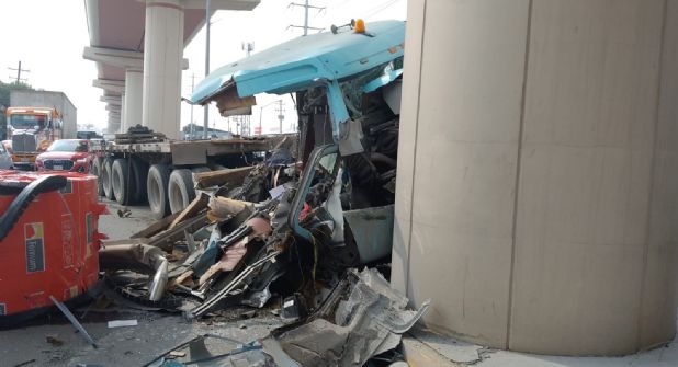 Monterrey.- Tras ser obstruido en su camino, un tráiler de carga chocó contra un rollo de acero para posteriormente colisionar en contra de uno de los capiteles de la Línea 3 del Metro sobre la avenida López Mateos, frente al Hospital Metropolitano, en el municipio de San Nicolás.