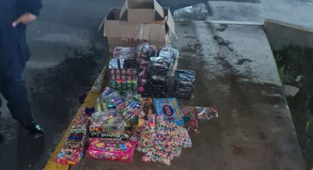 Además, se hallaron cuatro charolas con 10 piezas, dos cajas de luces de colores con 10 piezas, dos cajas de luces intermitentes con 10 piezas, dos cajas de cometas luminosas, seis cajas de luces con 10 piezas, tres tiras de luces con 10 piezas y cinco bolsas de palomas luminosas con 10 piezas cada una.