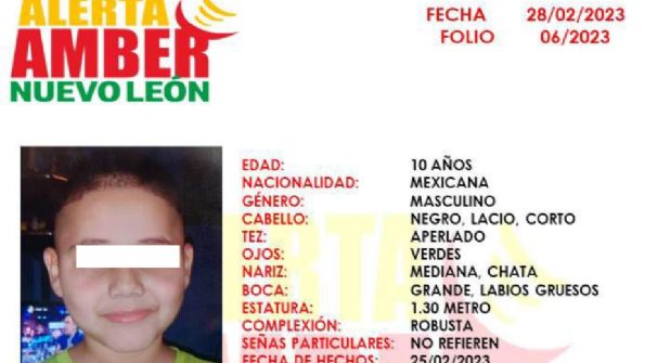 Monterrey.- Un niño de 10 años desapareció el pasado sábado 25 de febrero, por lo que las autoridades de Nuevo León activaron la Alerta Amber para iniciar con su búsqueda, este 28 de febrero, tres días después de su desaparición.