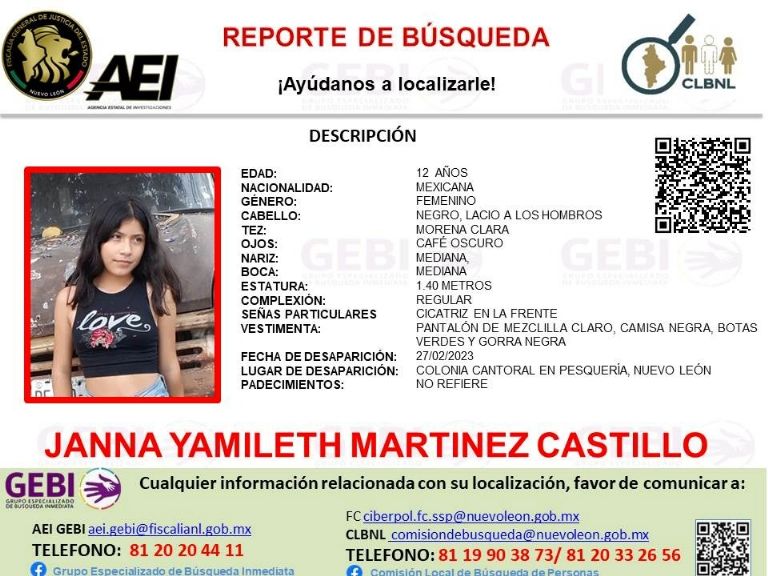 En cuanto a la última persona desaparecida el día de ayer en Pesquería, se trata de una joven de 12 años de edad identificada como Brithny Pérez Gudiño, quien fue vista por última vez en la Colonia Lomas de San Martín.