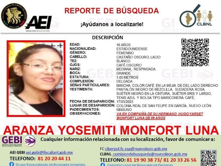 De acuerdo a la ficha de búsqueda emitida por la Agencia Estatal de Investigaciones (AEI) y el Grupo Especializado de Búsqueda Inmediata (GEBI), los menores son identificados como Hugo Yarset Monfort Luna de 9 años y Aranza Yosemiti Monfort Luna de 16.