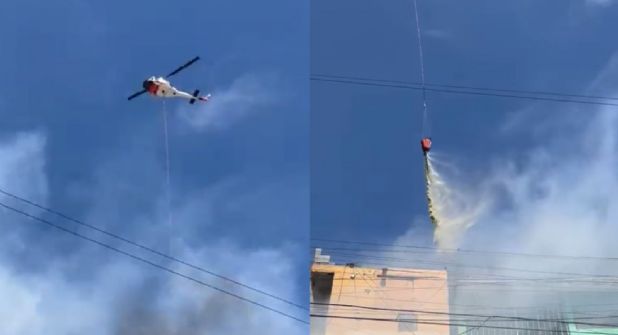 En videos proporcionados por Protección Civil se puede visualizar como en dos de los incendios de esta tarde, el helicóptero BELL 205 realizó descargas de agua por vía la aérea para sofocar el incendio de una vivienda ubicada en la colonia Fomerrey 106.