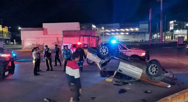 Posteriormente, el conductor siguió su camino evadiendo el operativo para después subirse a la banqueta de un estacionamiento y terminar volcado dentro del mismo.