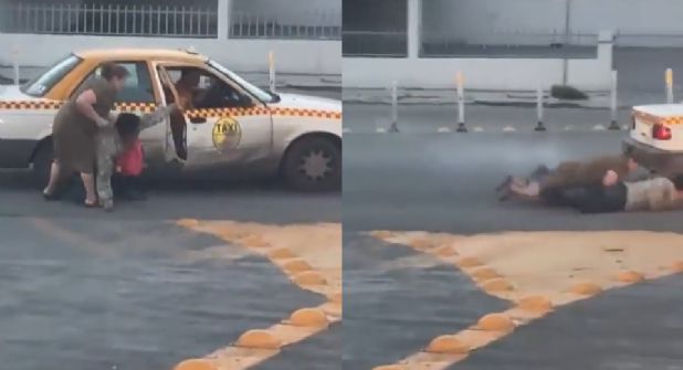 Mientras el hombre está en el suelo se sujeta de la puerta del automóvil tipo tsuru y, por su parte, el taxista sigue manejando. Al ver que el hombre y la mujer no se dan por vencidos, el taxista opta por acelerar y, cuando lo hace, tanto el hombre como la mujer quedan tirados sobre el asfalto. A través de redes sociales, usuarios denunciaron la conducta del taxista, acusándolo de robar a esta familia, así como de provocar su caída.