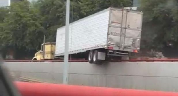 Pese a que el conductor patinó sobre el muro de contención, el tráiler no terminó por volcarse sobre la avenida, pues cuando se encontraba deslizándose sobre el barandal, el conductor pudo incorporarse al carril de la calle.