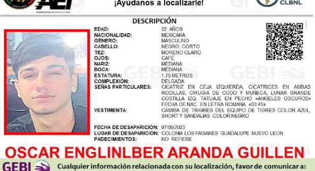 Oscar Englinlber Aranda Guillen, de 22, fue visto por última vez el pasado 7 de mayo de 2023, en la colonia antes mencionada.