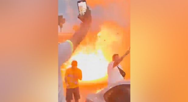 Aunque ya se habían presentado fuegos artificiales hacia el cielo, en esta ocasión se dio uno en el costado donde se dirigía el autobús y había varias personas.