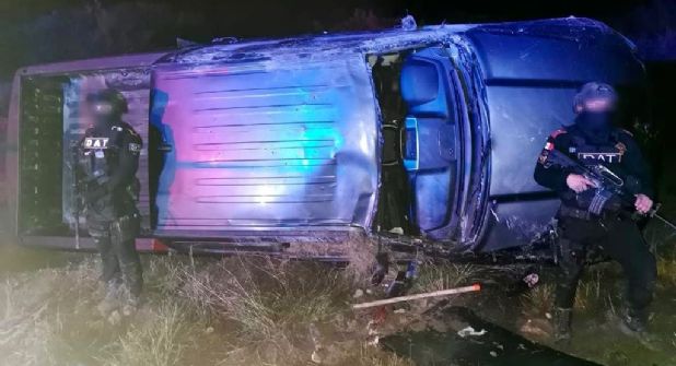 La respuesta de los uniformados no se hizo esperar, así que se desató una persecución con detonaciones de por medio. Cuando los policías le dieron alcance a los sujetos armados, éstos sufrieron la volcadura de uno de sus vehículos después de ser desestabilizada de un golpe.