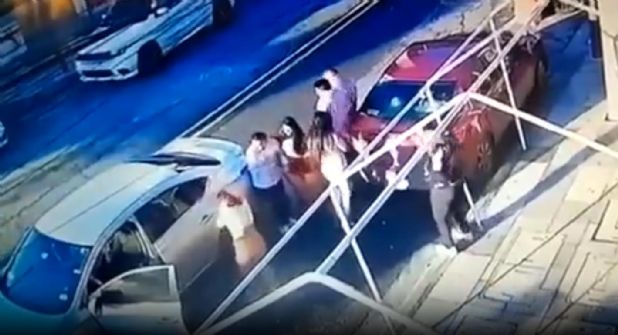 En la pantalla se observa como un hombre de suéter color verde y gorra blanca manejó un arma de fuego, la cual utilizó para dispararle a una persona que se había refugiado en uno de los autos que estaban estacionados.