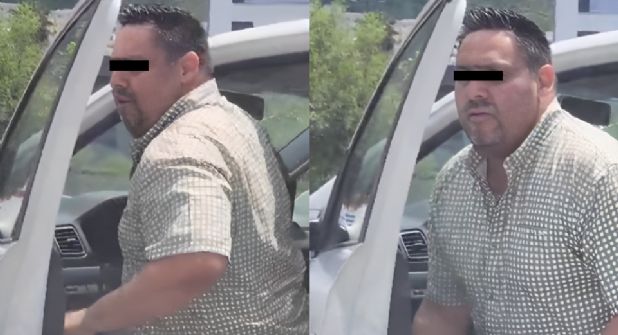 Lo que se muestra en el clip, grabado por personas que estaban dentro de un vehículo, es a un hombre de complexión robusta, con camisa a cuadros color verde y pantalón beige, descendiendo de una camioneta color blanca con cierto enfado.