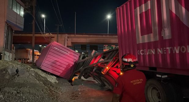 Monterrey. – Un tractocamión con doble remolque se volcó esta madrugada de viernes 18 de agosto luego de caer a una zanja producida por una obra de Servicios de Agua y Drenaje de Monterrey.