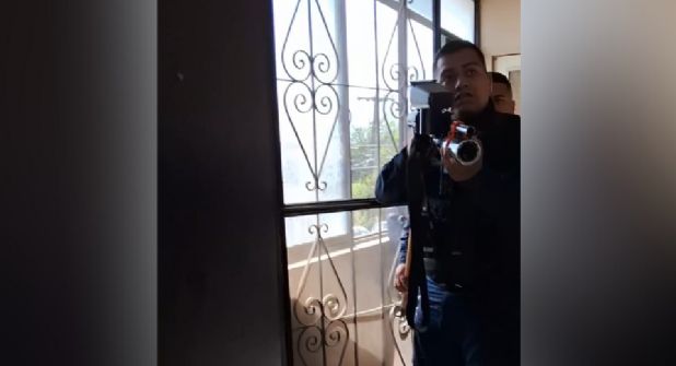 Otro de los policías, quien sostiene una especie de arma apunta a los habitantes de la casa, algunos de ellos, mujeres menores de edad y niños.