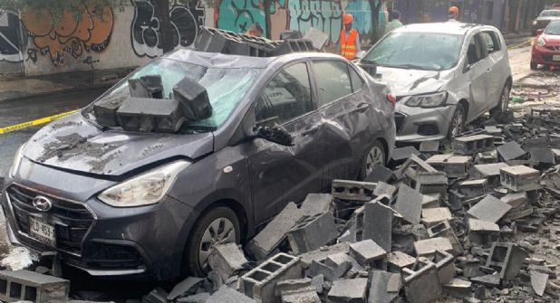 Monterrey.-Una barda de bloques cayó de un segundo piso dejando daños materiales en dos vehículos estacionados sobre la calle Arteaga y Ramón Corona.