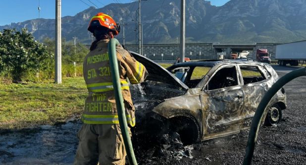 Con el apoyo de una pipa de agua perteneciente a una empresa privada, los cuerpos de rescate trabajaron rápidamente para sofocar las llamas que envolvieron por completo al vehículo.