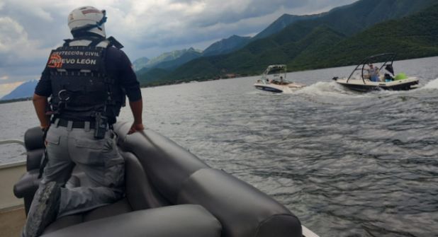 Monterrey.- Elementos de Protección Civil de Nuevo León rescataron un grupo de personas que viajaban a bordo de una lancha que quedó varada en la presa de La Boca.