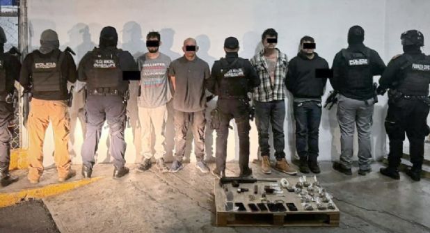 A los detenidos les aseguraron un fusil de asalto Uzi calibre 9 milímetros, un cargador con 19 cartuchos hábiles, un arma de fuego corta, 14 envoltorios de plástico transparente con hierba seca-al parecer mariguana-, un cuchillo, una báscula, unas esposas, siete celulares y dinero en efectivo.