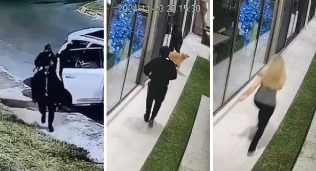 En ellos se aprecia, primero, como la dama cerró una puerta y salió corriendo por el pasillo para luego entrar a la casa y encerrarse con llave, esto mientras fue perseguida por un hombre con ropa negra, quien no pudo ingresar a la vivienda y se quedó en el patio junto al perro de la familia, quien intentó jugar con él.