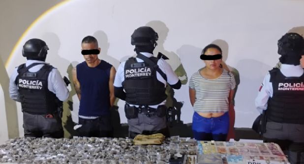 Monterrey. – Elementos de la Policía de Monterrey detuvieron ayer lunes a una pareja que, además de circular en una camioneta con placas “colgadas”, portaba un arma de fuego y varias dosis de drogas.