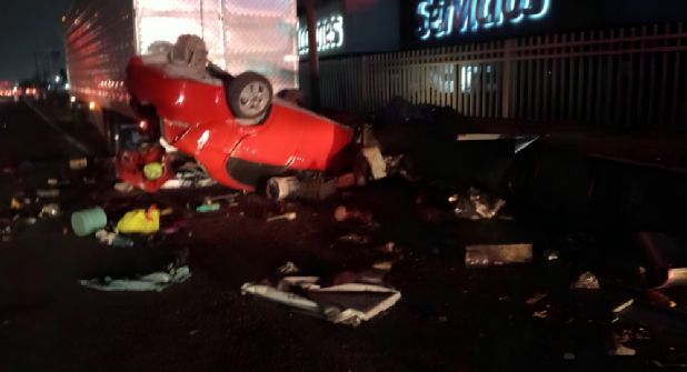 En imágenes compartidas por Protección Civil estatal se aprecia un auto rojo volcado, así como también el puesto donde laboraban las mujeres, destruido.