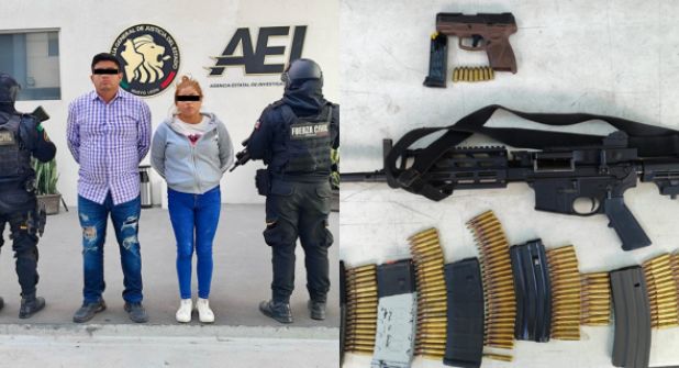 Los detenidos, identificados como Epifanio “N”, de 26 años, y María “N”, de 29, fueron sometidos a una revisión precautoria, donde se les aseguró un arma larga abastecida con 30 cartuchos, un arma corta con ocho balas, cuatro cargadores con 96 cartuchos adicionales, 50 dosis de una sustancia similar al cristal, una báscula digital, 14 ponchallantas, dos chalecos balísticos y una fornitura con porta cargador, y dinero en efectivo.